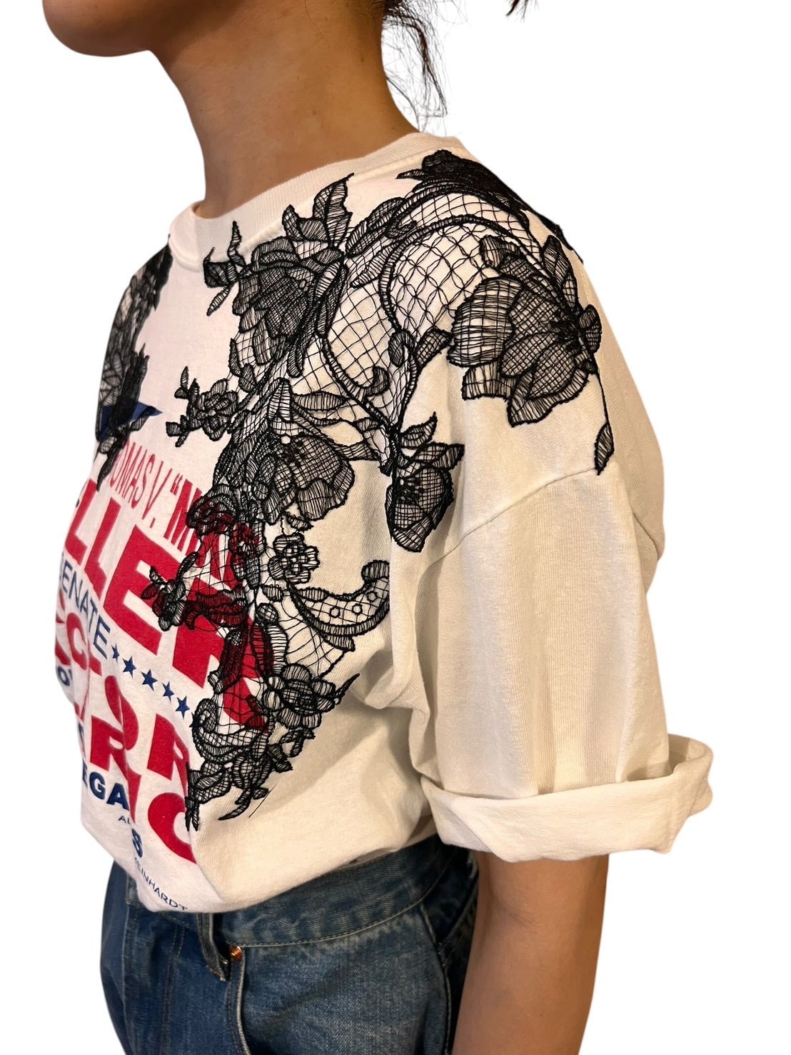ホワイトボディのヴィンテージTシャツに、ブラックのフラワーレースを肩周りへ大胆に重ねたリメイクT。