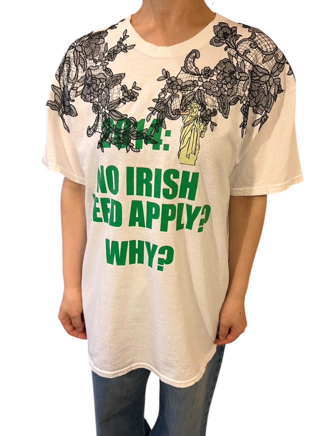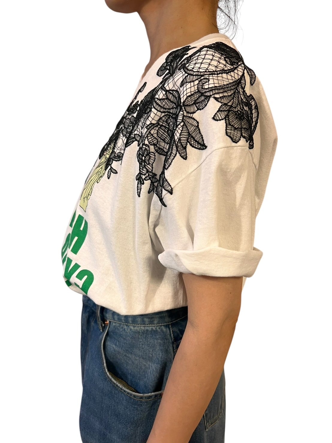 ホワイトボディのヴィンテージTシャツに、ブラックのフラワーレースを肩周りへ重ねたリメイクT。