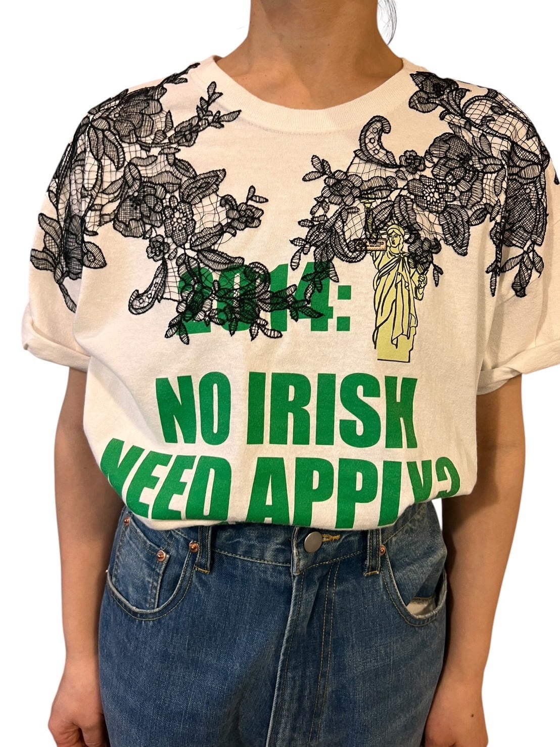 ストリート感のあるメッセージ性の強いプリントに、繊細なレースを重ねることで、ラフさとモード感が共存するバランスに。