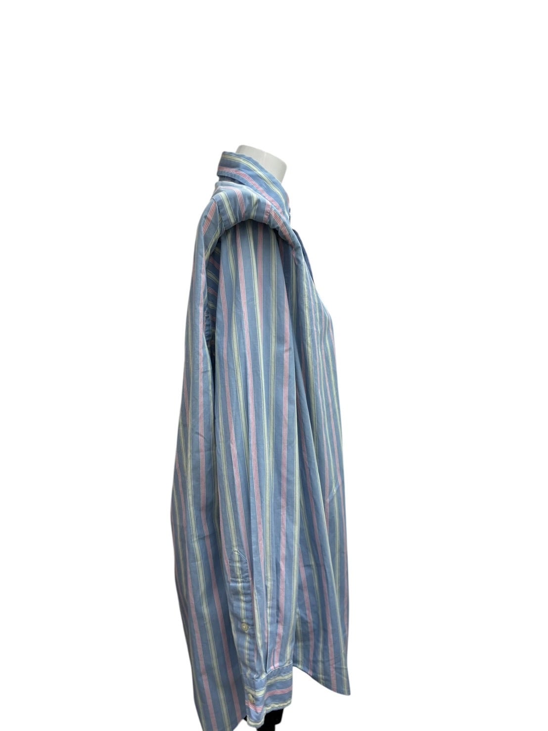 ブルーをベースにピンクを差し込んだストライプシャツを、パワーショルダーでモードに昇華。軽やかな配色と縦に走るラインが、爽やかな印象を与える一着です。